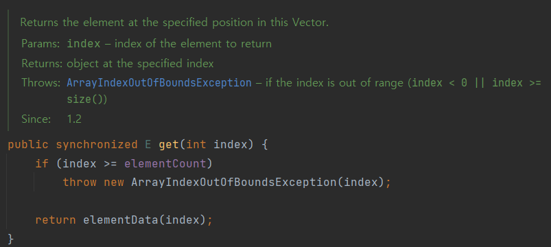 E | get(int index) | index 위치의 원솟값을 꺼내 리턴 |