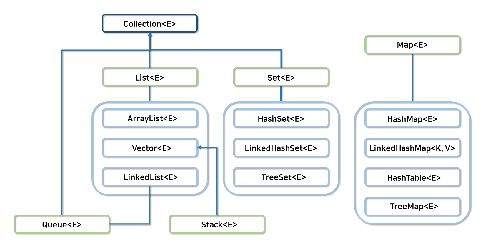 컬렉션의 특성에 따라 구분하면 크게 List<E>, Set<E>, Map<K, V>로 나눌 수 있고, 메모리의 입출력 특성에 따라 기존의 컬렉션 기능을 확장 또는 조합한 Stack<E>, Queue<E>가 있다.