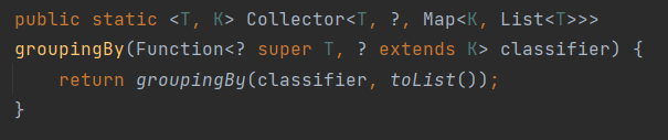 groupingBy() 메소드는 제네릭 메소드이고, Function을 이용해서 T를 K로 매핑하고, K를 키로 가지면서 List<T>를 값으로 갖는 Map 컬렉션을 생성한다.