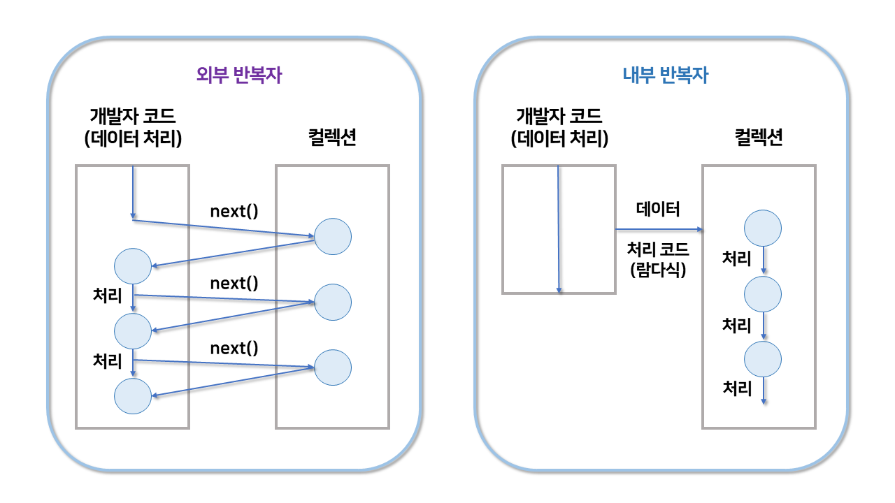 외부 반복자일 경우에는 컬렉션의 요소를 외부로 가져오는 코드와 처리하는 코드를 모두 개발자 코드가 가지고 있어야 한다.