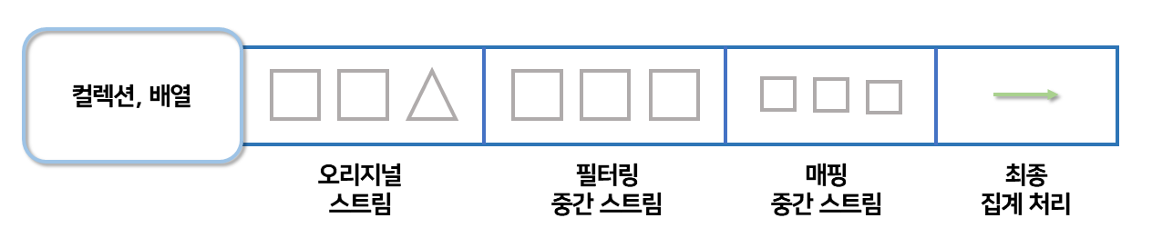 아래 그림을 보면 컬렉션의 오리지널 스트림 뒤에 필터링 중간 스트림이 연결될 수 있고, 그 뒤에 매핑 중간 스트림이 연결될 수 있다.